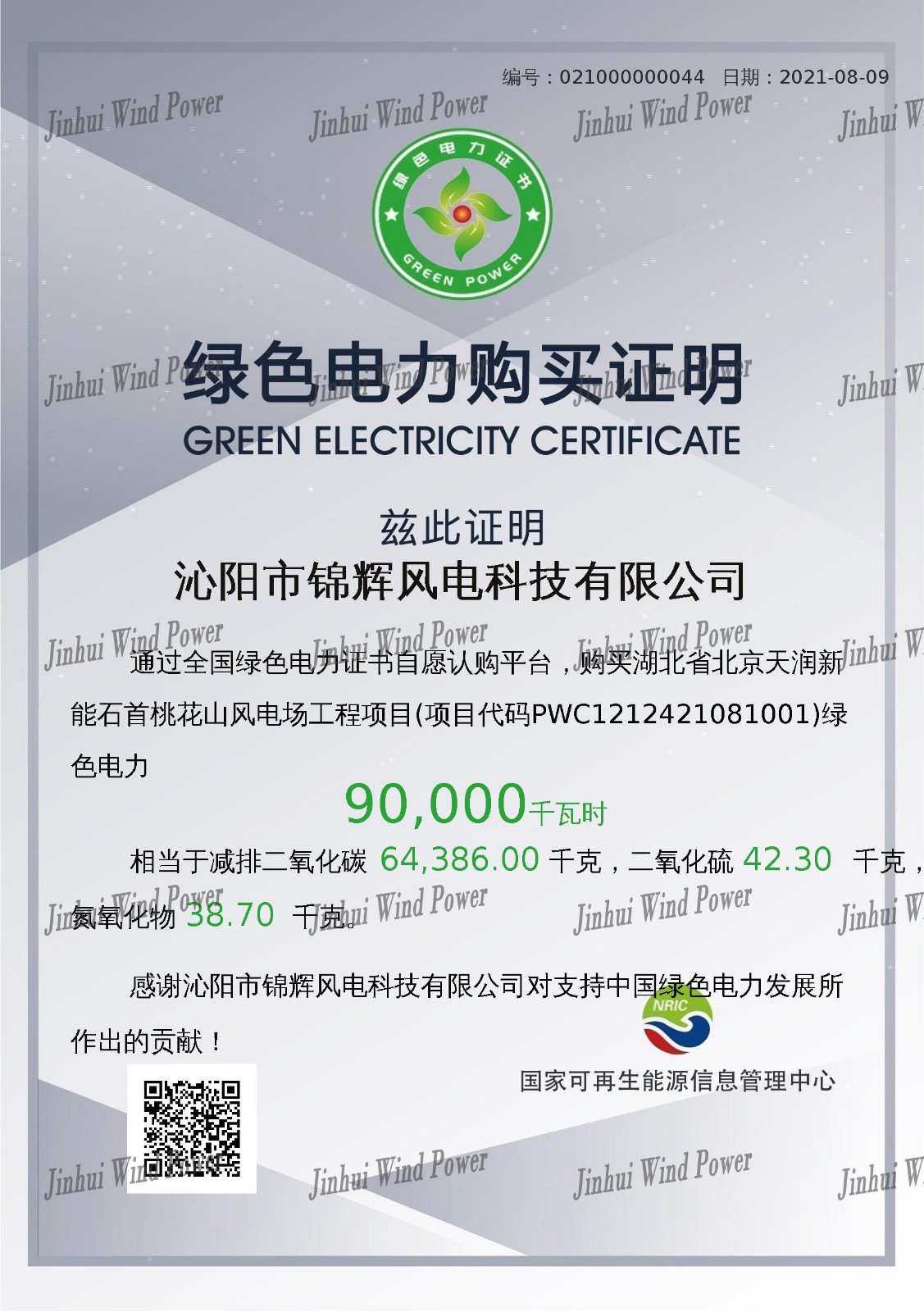 今天我公司正式啟用綠電,開展光伏、風力發電的電量交易,實現用電零碳排放的目標。在2020.8-2021.7公司總使用電量584541度,綠電使用90000度,使用率是15.4%,綠電全部用于金風產品的生產制造過程,公司承諾5年內綠電使用率達到100%。